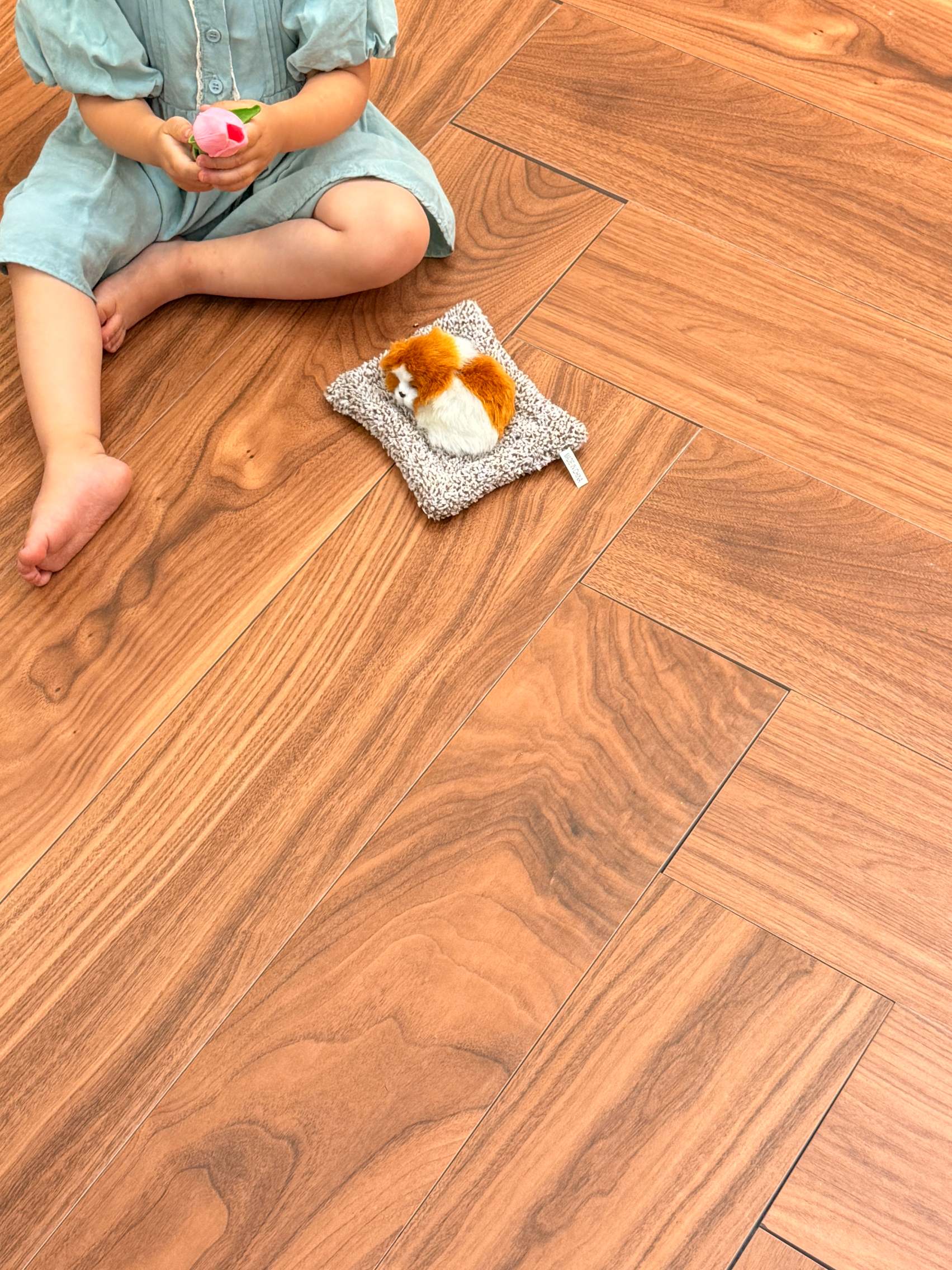 Wood-look porcelain tiles offering the beauty of hardwood with superior water resistance.
